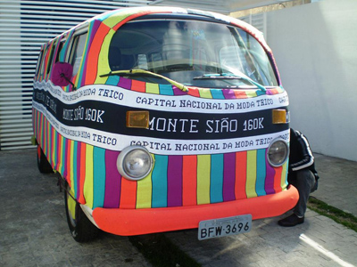 Uma Kombi totalmente envelopada, ou melhor, ‘vestida’ com uma peça única de tricot, fica estacionada em frente ao pavilhão da Bienal, no Ibirapuera, palco do maior evento de moda do Brasil, o São Paulo Fashion Week.